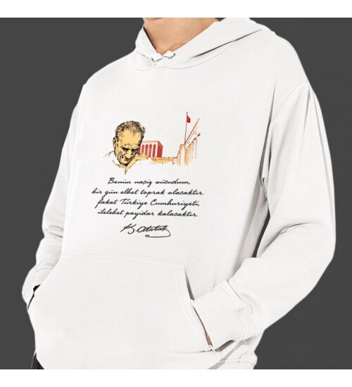 Atatürk Baskılı Kapşonlu Beyaz Unisex Sweatshirt HK2290