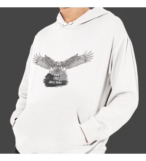 Kişiye Özel Kara Kartal Baskılı Kapşonlu Beyaz Unisex Sweatshirt HK2166